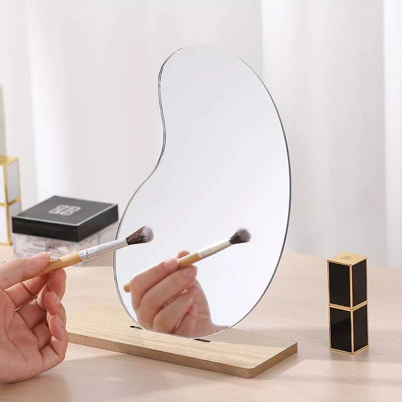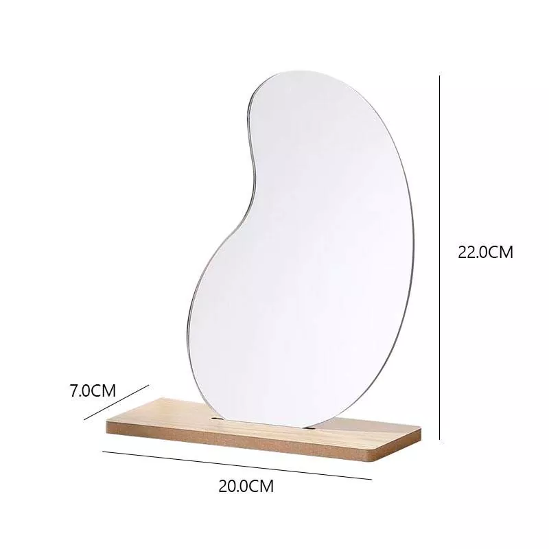 Это настольное зеркало неправильной и волнистой формы имеет минималистский художественный силуэт, который органично сочетается с современным домашним декором. Изготовленный из прозрачного стекла высокой четкости и гладкой деревянной основы, он обеспечивает отражение без искажений, идеально подходящее для нанесения макияжа, процедур по уходу за кожей и ежедневного ухода за собой.