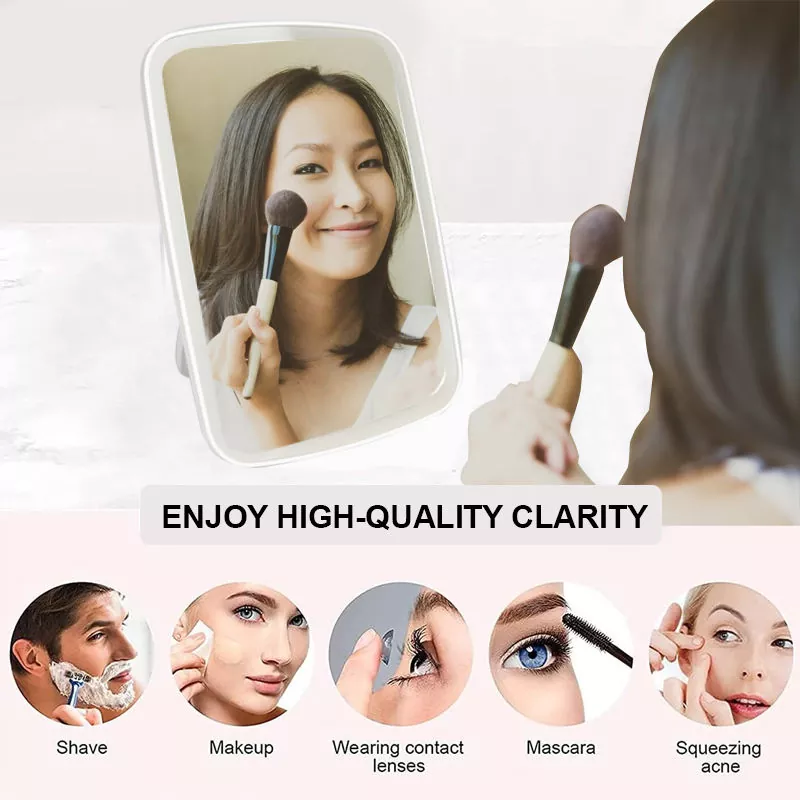 Это настольное зеркало для макияжа со светодиодной подсветкой имеет 3 регулируемых режима освещения (холодный, естественный, теплый), подходящие для различных сценариев макияжа, обеспечивая реалистичное освещение для точного нанесения. Регулируемая на 100° подставка обеспечивает гибкие углы обзора, а тонкий и легкий дизайн обеспечивает удобство переноски.